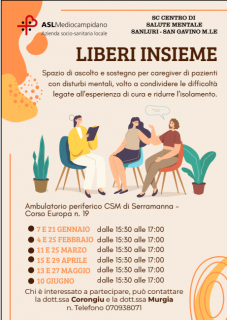 Sede: Gli incontri avranno luogo presso l’ambulatorio periferico CSM di Serramanna, in Corso Europa n. 19.